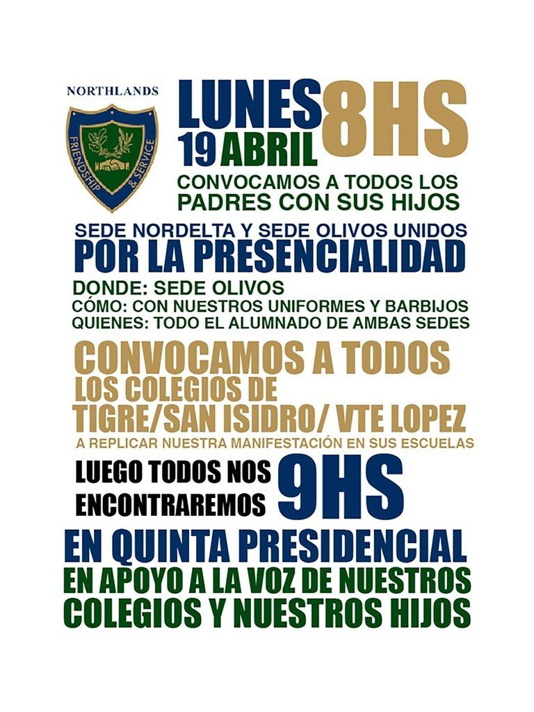 “El lunes 19 de abril a las 8 de la mañana vamos a la escuela con nuestros hijos e hijas. Abrazo simbólico a la educación. Daremos la vuelta a la manzana con barbijos y distancia social. Sugerimos (usar) remera blanca sin logo y pantalón azul. Defendamos los derechos de la niñez que consagra la Constitución Nacional”, señala una de las convocatorias publicadas por Infobae.