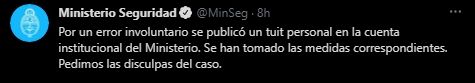 Tras eliminar el tuit, desde el Ministerio de Seguridad de la Nación salieron a dar explicaciones sobre lo sucedido. "Por un error involuntario se publicó un tuit personal en la cuenta institucional del Ministerio. Se han tomado las medidas correspondientes. Pedimos las disculpas del caso", explicaron.
