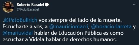 "Patricia Bullrich, vos siempre del lado de la muerte. Escucharte a vos, a Mauricio Macri, a Horacio Rodríguez Larreta y a María Eugenia Vidal hablar de Educación Pública es como escuchar a Videla hablar de derechos humanos", fue la desafortunada analogía que el dirigente gremial publicó en Twitter.