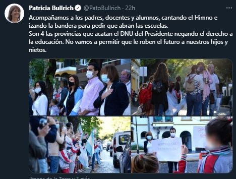 La presidenta del PRO se viene manifestando en contra de la suspensión de las clases presenciales, medida que anunció Alberto Fernández al menos hasta el 30 de abril en AMBA.