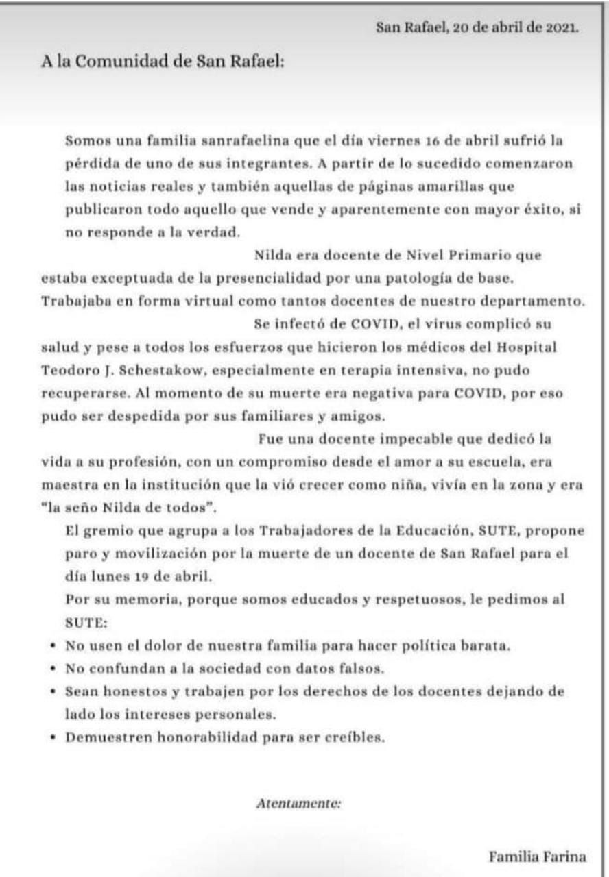 La carta de la familia Farina sostiene que la docente de nivel primario "estaba exceptuada de la presencialidad por una patología de base". Por lo tanto, "trabajaba en forma virtual como tantos docentes de nuestro departamento".