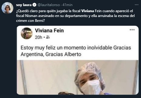 "¿Se acuerdan de la fiscal Viviana Fein, la que pisoteó la escena del asesinato de Nisman? Bueno, acá la tienen haciendo la "V" y agradeciendo a Alberto Fernández", se sumó a las críticas otro usuario en Twitter.