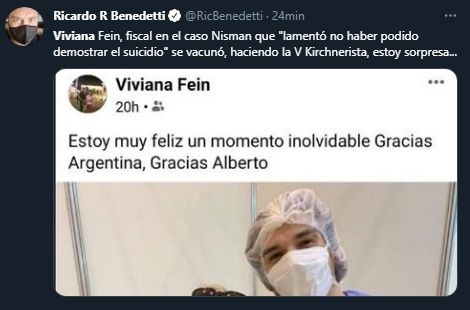 "Viviana Fein, fiscal en el caso Nisman que "lamentó no haber podido demostrar el suicidio", se vacunó haciendo la V Kirchnerista, estoy sorpresa", se sumó a los cuestionamientos el periodista Ricardo Benedetti.