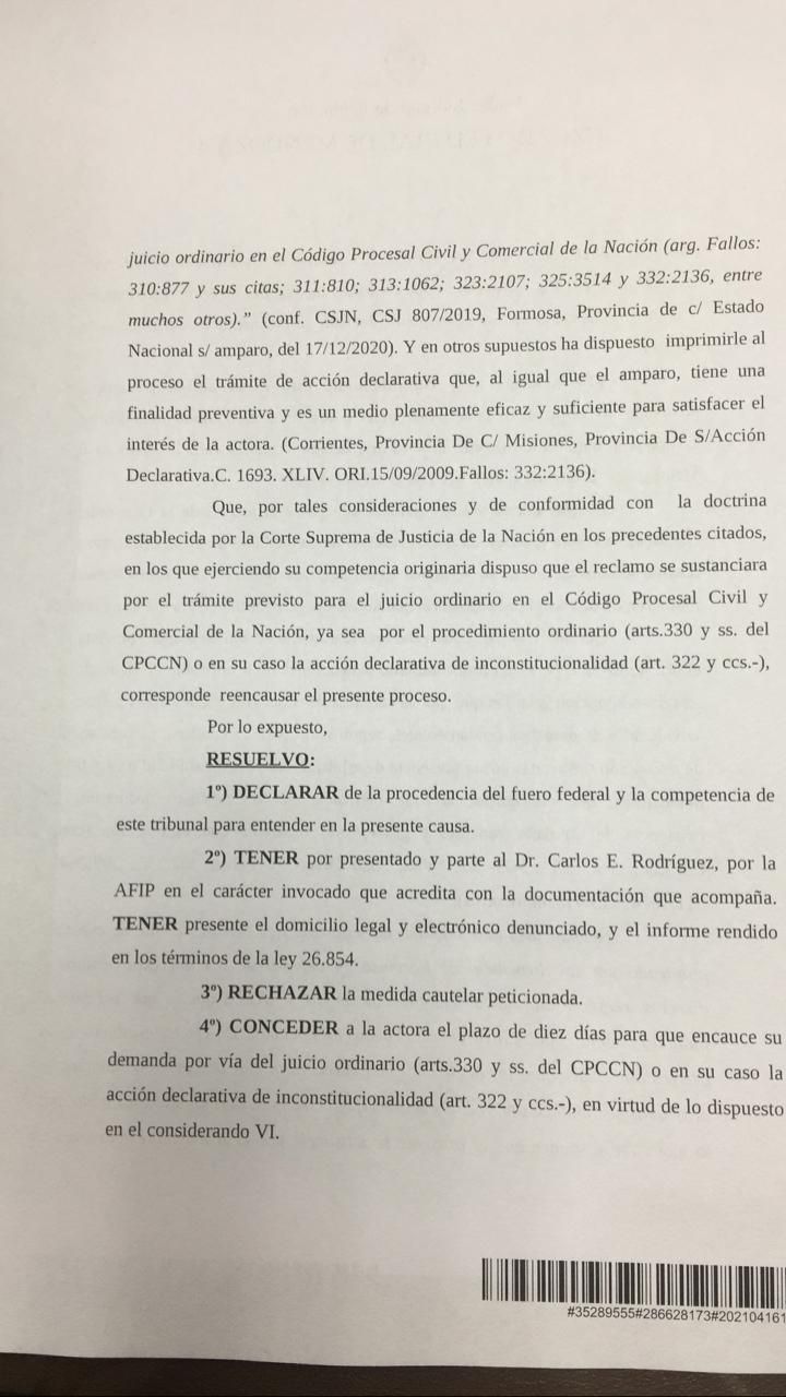 El fallo emitido por la flamante jueza Susana Pravata dispone además "conceder a la actora el plazo de diez días para que encauce su demanda por vía del juicio ordinario o en su caso la acción declarativa de inconstitucionalidad".