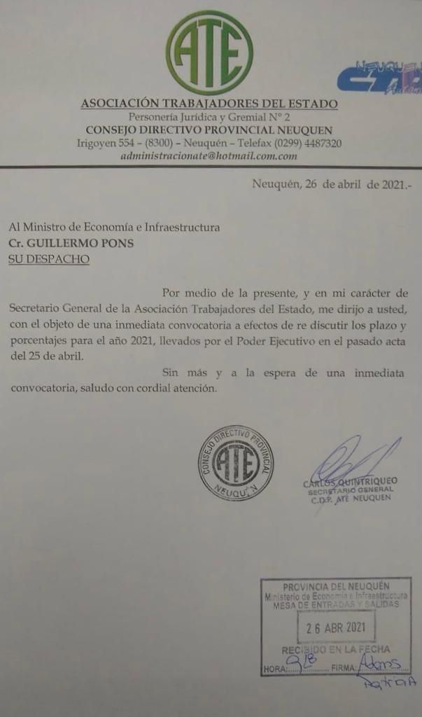 El portal La mañana Neuquén indicó que el pedido llegó a través de una nota firmada por el secretario general de ATE, Carlos Quintriqueo, y enviada al ministro de Economía e Infraestructura, Guillermo Pons.