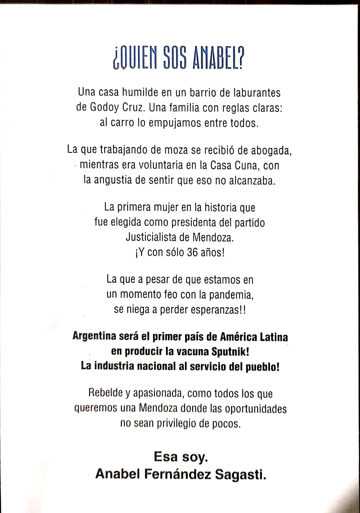 La senadora nacional Anabel Fernández Sagasti aspira a renovar su banca en la Cámara Alta y sueña con gobernar la provincia de Mendoza. Es la líder indiscutida de la oposición en Mendoza, pero aún debe mejorar en las encuestas para poder cumplir sus ambiciones. Quizás ese sea el motivo por el cual miles de mendocinos encontraron un curioso panfleto debajo de sus puertas. "¿Quién sos Anabel?", es el título y entre fotografías de su infancia y adolescencia, la propia Fernández Sagasti se encarga de contestar esa pregunta.