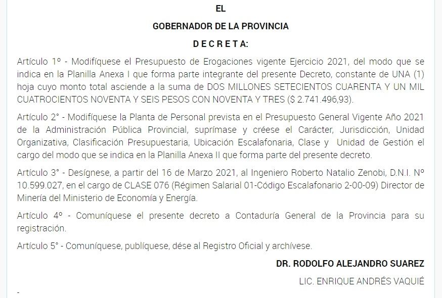 Roberto Zenobi fue presidente de la Cámara de Empresarios Mineros y hoy ha quedado oficialmente designado como Director de Minería de la provincia. Así consta en el decreto 248 firmado por el gobernador Rodolfo Suarez y publicado este lunes en el Boletín Oficial.