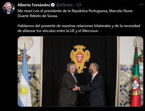 El presidente Alberto Fernández cerró su visita a Portugal con una reunión con el Premier de Portugal Antonio Costa, a quien le pidió apoyo en la negociación con el Fondo Monetario Internacional (FMI) que lleva adelante el gobierno para refinanciar la deuda de 44.000 millones de dólares contraída durante el gobierno de Mauricio Macri.