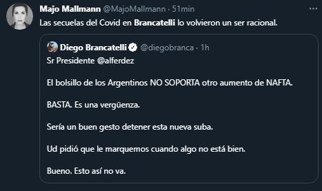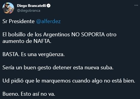 "Sr. Presidente @alferdez, el bolsillo de los Argentinos NO SOPORTA otro aumento de NAFTA. BASTA. Es una vergüenza", se quejó Brancatelli en su cuenta de Twitter.
