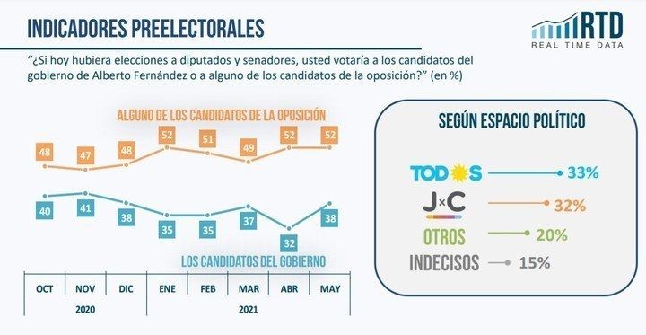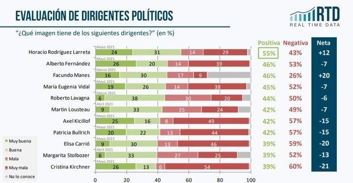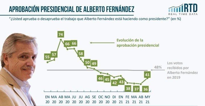 Una encuesta de Real Time Data (RTD) muestra que la aprobación presidencial mejoró. En un relevamiento que se hizo entre el 3 y 9 de mayo, en 913 casos y con un margen de error de +/-4%, la empresa del politólogo Nicolás Solari concluyó que la medición marcó una recuperación de cinco puntos y es una de las pocas variaciones positivas que registra la presidencia de Alberto Fernández.