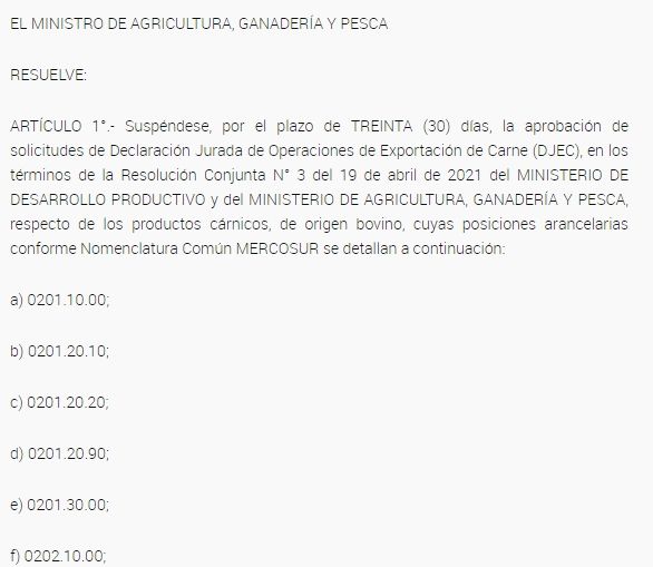 El Gobierno de Alberto Fernández oficializó la suspensión de la exportación de carne durante 30 días este jueves con la publicación de la Resolución 75/2021 en el Boletín Oficial de la Nación.