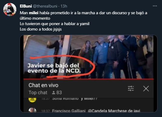 Sin embargo, Milei se ausentó a la marcha y generó la recriminación de quienes organizaban el evento. "Los medios lo atacaron y esa persona se cagó. Lo entiendo porque es humano, pero para ser político hay que tener palabra", lo criticó Martín Almeida, uno de los organizadores del evento.