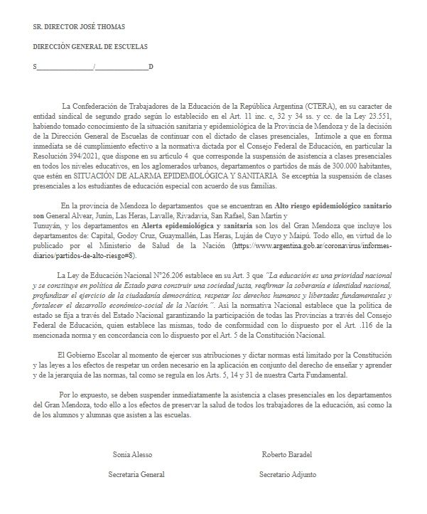 "Habiendo tomado conocimiento de la situación sanitaria y epidemiológica de la Provincia de Mendoza y de la decisión de la Dirección General de Escuelas de continuar con el dictado de clases presenciales, intímole a que en forma inmediata se dé cumplimiento efectivo a la normativa dictada por el Consejo Federal de Educación", asevera la carta dirigida a Thomas.