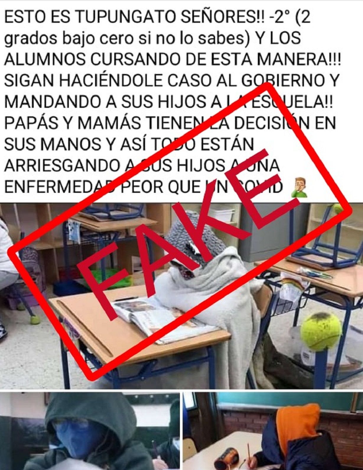 Falso: desmienten imágenes de alumnos con frazadas en Tupungato