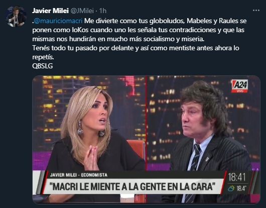 "Es irritante porque demostró que es un mentiroso, un ladrón de ideas, un ladrón de banderas. En este resurgir liberal se está despertando mucha gente. Para tratar de captar toda esta oleada liberal, el delincuente de Macri se quiere robar las banderas de la libertad", disparó Milei, enojado por el discurso que ha adoptado el expresidente.
