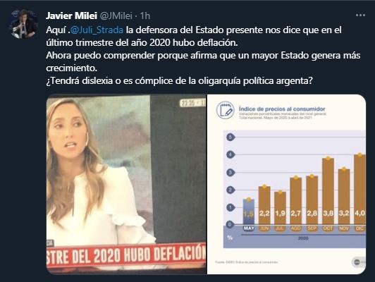 "Se roba las ideas, que es más grave todavía. Está mintiendo a la gente en la cara. Cuando habla de la reforma del Estado, del sistema laboral o la apertura después pide un consejo a Felipe González que es un socialista, y puso a Macos Peña de jefe de Gabinete que es otro socialista", recordó Milei, quien también arremetió contra la ex gobernadora bonaerense María Eugenia Vidal. "Vidal es recontra zurda", se quejó el economista liberal.