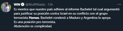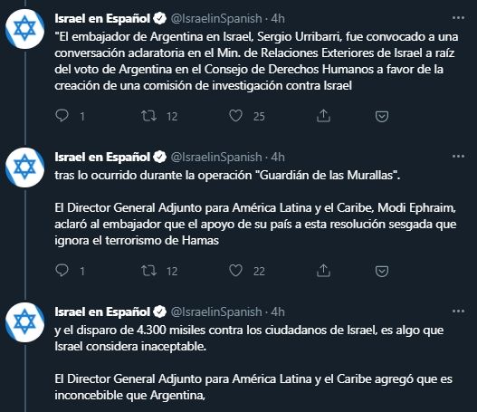 "El Director General Adjunto para América Latina y el Caribe, Modi Ephraim, aclaró al embajador que el apoyo de su país a esta resolución sesgada que ignora el terrorismo de Hamás y el disparo de 4.300 misiles contra los ciudadanos de Israel, es algo que Israel considera inaceptable".