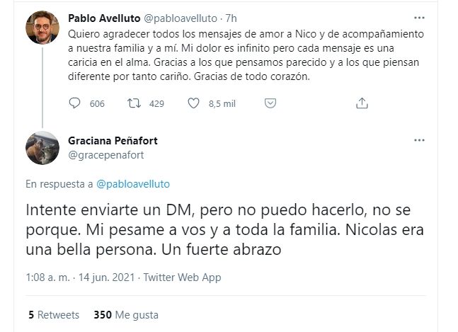 "Quiero agradecer todos los mensajes de amor a Nico y de acompañamiento a nuestra familia y a mí", señaló Pablo Avelluto en las redes sociales y dijo estar muy afectado por la situación. "Mi dolor es infinito pero cada mensaje es una caricia en el alma", remarcó.