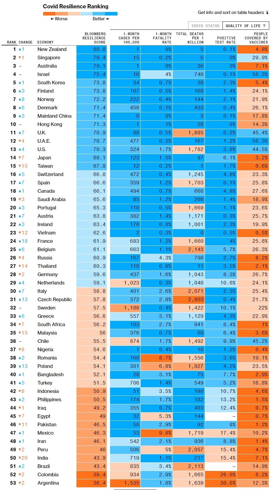 La prestigiosa agencia internacional Bloomberg elaboró el "Ranking de Resiliencia", en el que a partir de una amplia variedad de datos, determina dónde se está manejando la pandemia con mayor efectividad y con menores inconvenientes sociales y económicos. Asimismo, evalúa estadísticas de parámetros tales como la tasa de mortalidad, la cantidad de testeos, la tasa de positividad, el acceso a la vacuna, la severidad en las restricciones a la circulación y la evolución del PBI.
