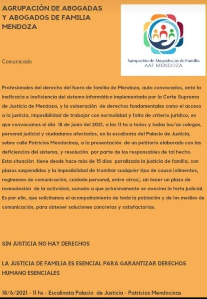 "La justicia de familia parece estar en un rango inferior a los otros fueros", aseveró. En la convocatoria a la protesta para el 18 de junio a las 11 de la mañana los abogados afirman que "esta situación tiene desde hace más de 15 días paralizada a la Justicia de Familia, con plazos suspendidos y la imposibilidad de tramitar cualquier tipo de causa.