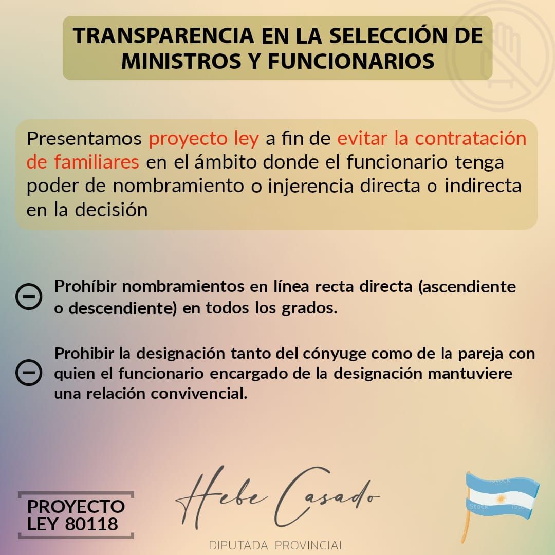 Eso es lo que ha propuesto la diputada Hebe Casado. "El nepotismo es la preferencia que tienen algunos funcionarios públicos para dar empleos a algunos familiares o amigos, sin importar el mérito para ocupar el cargo, sino su lealtad o alianza", sostiene. "Es de público conocimiento en Argentina y principalmente en política el uso de contactos de cercanía familiar para ocupar puestos y cargos de importancia pública, sin importar la idoneidad para dicho puesto", agrega.