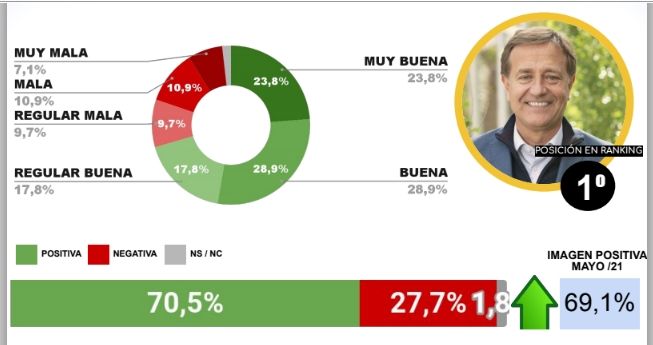 Según el trabajo realizado por la consultora, Suarez mejoró su imagen positiva el último mes un 1,4% y pasó del 69,1% al 70,5%, catapultándolo al primer lugar de la tabla. La imagen negativa del mandatario mendocino es del 27,7%. Los datos se relevaron entre el 12 y el 14 de junio, días en los que se consultó a 832 personas.