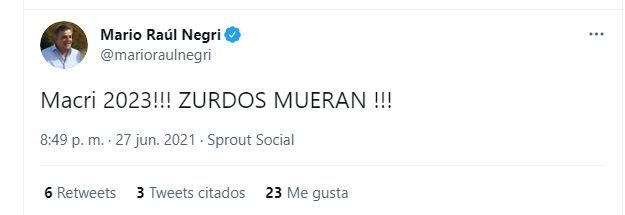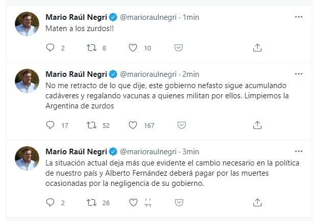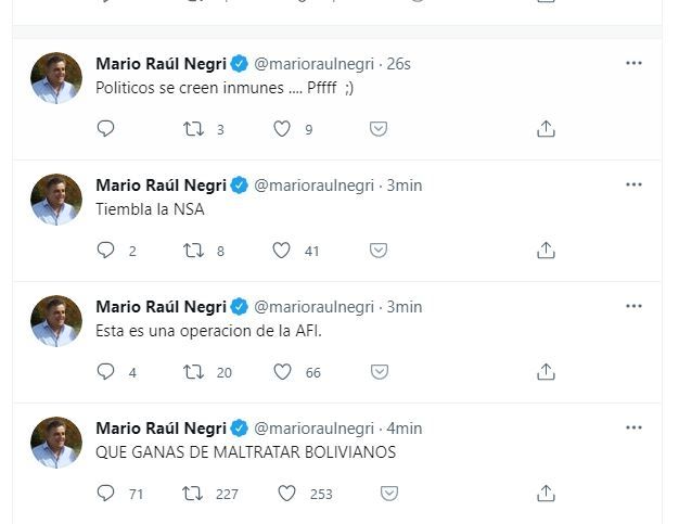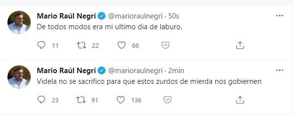 "Mueran, zurdos", "Qué ganas de maltratar bolivianos" y "Macri 2023" fueron algunos de los mensajes que alcanzaron a leerse, al tiempo que alguien de su entorno, o el propio Negri intentaba borrar las publicaciones.