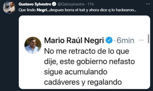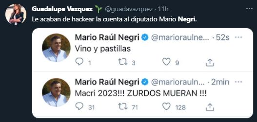 "Esta noche hackearon mi cuenta de Twitter groseramente. Estamos intentando recuperar el control de ella. Iniciaré acciones legales a los efectos de que se pueda conocer quiénes fueron. Evidentemente, a algunos estaré molestando. Nadie en su sano juicio puede pensar que la seguidilla de tuits racistas y violentos puede haber salido de mi persona", se lamentó Negri.