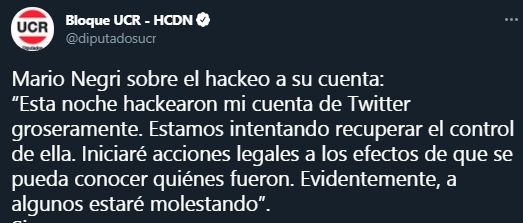 Tras lo ocurrido, el Comité Radical informó que el legislador sufrió un ataque cibernético y que todavía no logra resolver el problema. De hecho su cuenta fue suspendida en Twitter y habrá que ver si logra recuperarla o si debe hacerse una nueva.