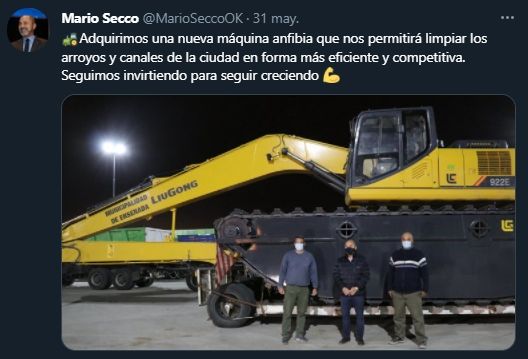 "Adquirimos una nueva máquina anfibia que nos permitirá limpiar los arroyos y canales de la ciudad en forma más eficiente y competitiva. Seguimos invirtiendo para seguir creciendo", anunció Secco el lunes a la noche en sus redes sociales.