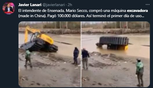 Luego de que las imágenes del accidente se viralizaran y generaran cientos de burlas en redes sociales, fue el propio Secco quien salió a dar la cara por lo sucedido. En su cuenta de Twitter, el jefe local explicó que "no es la primera vez que ocurre este tipo de accidente" y que "la retroexcavadora anfibia se encuentra en perfectas condiciones".