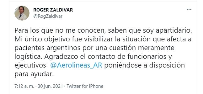 "Agradezco el contacto de funcionarios y ejecutivos de Aerolíneas Argentinas poniéndose a disposición para ayudar", remarcó Zaldivar. En este sentido, aclaró que su reclamo no tenía intencionalidad política sino que el único objetivo era "visibilizar la situación que afecta a pacientes argentinos por una cuestión meramente logística".