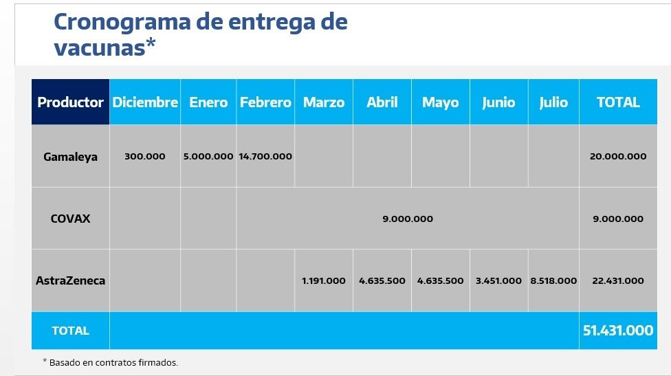 El plan oficial incluía la llegada progresiva de vacunas Sputnik V. Eran 300 mil en diciembre, 5 millones en enero y 14,7 millones en febrero. Todas para aplicar antes del otoño. Las de AstraZeneca debían llegar en tandas grandes desde marzo. Eran 5,9 millones en marzo y abril, por ejemplo. Además, se esperaban 9 millones del fondo Covax hasta julio. En las últimas semanas se aceleró fuertemente la vacunación, luego de que, ahora sí, comenzaran a llegar las partidas prometidas y que el Gobierno hasta había pagado (como ocurre con la vacuna de AstraZeneca).
