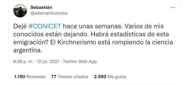 "Dejé el Conicet hace algunas semanas. Varios de mis conocidos están dejando. ¿Habrá estadísticas de esta emigración?", manifestó.