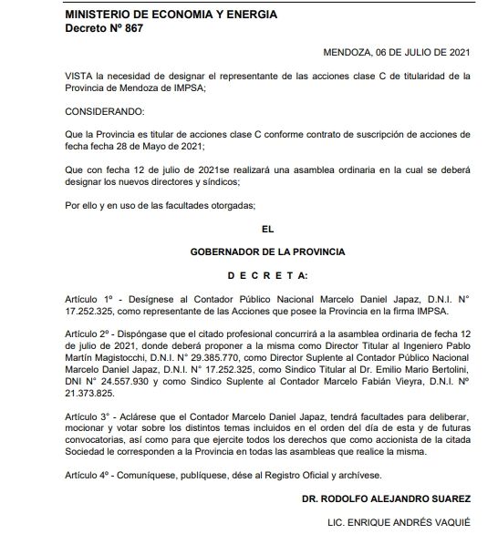 "Aclárese que el Contador Marcelo Daniel Japaz, tendrá facultades para deliberar, mocionar y votar sobre los distintos temas incluidos en el orden del día de esta y de futuras convocatorias, así como para que ejercite todos los derechos que como accionista de la citada Sociedad le corresponden a la Provincia en todas las asambleas que realice la misma", sostiene el decreto firmado el 6 de julio.