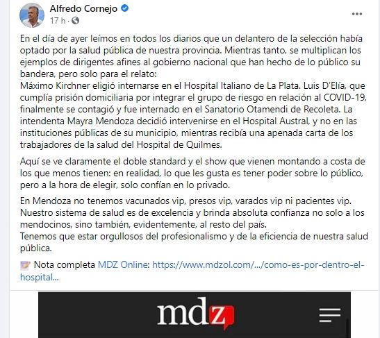 A través de su cuenta de Facebook, Alfredo Cornejo tomó como disparador una nota de MDZ que relató que el delantero de la selección había optado por la salud pública de la provincia de Mendoza para que atendieran de urgencia a su hija de tan solo 5 meses. Y en el comienzo de su posteo aprovechó para exponer que hay dirigentes afines al gobierno nacional que usan lo público solo para el relato.