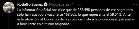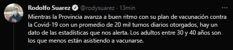"Mientras la Provincia avanza a buen ritmo con su plan de vacunación contra la covid-19 con un promedio de 20 mil turnos diarios otorgados, hay un dato de las estadísticas que nos alerta. Los adultos entre 30 y 40 años son los que menos están asistiendo a vacunarse", se lamentó Suarez en su cuenta de Twitter.