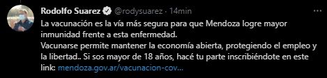 "La vacunación es la vía más segura para que Mendoza logre mayor inmunidad frente a esta enfermedad. Vacunarse permite mantener la economía abierta, protegiendo el empleo y la libertad. Si sos mayor de 18 años, hacé tu parte inscribiéndote en este link: www.mendoza.gov.ar/vacunacion-covid-19", completó el gobernador.