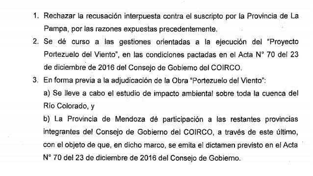 Las especulaciones sobre la pertinencia o no de la adjudicación tienen como agregado los litigios con La Pampa y el Coirco. Si bien la obra está garantizada por el Laudo de Mauricio Macri, ese mismo documento condiciona la adjudicación a varios factores. Por un lado a que se haga el estudio de impacto ambiental de toda la cuenca (tema que Mendoza asegura cumplió y el resto de las provincias no) y a que se cumplan los acuerdos previos del Consejo de Gobierno del Coirco. Es decir, el órgano máximo de control de la cuenca, que está formado por los gobernadores de Buenos Aires, La Pampa, Neuquén, Río Negro y Mendoza.