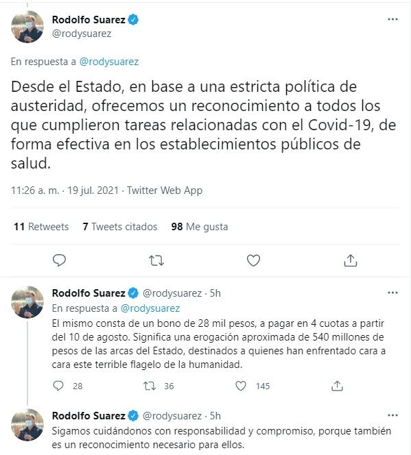 El gobernador de la provincia, Rodolfo Suarez, a través de su cuenta de Twitter, anunció que otorgarán un bono de 28 mil pesos para los trabajadores de la salud. El mismo se pagará en cuatro cuotas y la primera será a partir del 10 de agosto. Isabel Del Pópolo, secretaria general del AMProS, en MDZ Radio aseguró que no aceptarán aumentos en negro.