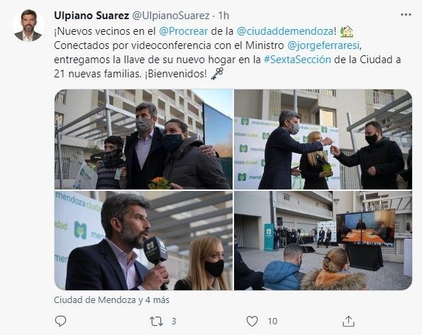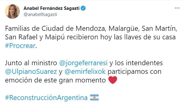 En cinco departamentos de la provincia de Mendoza se entregaron viviendas bajo el programa Procrear, entre ellos, Ciudad, Maipú, San Martín y San Rafael. El acto principal se desarrolló en la capital mendocina donde estuvieron presentes el intendente Ulpiano Suarez y la senadora nacional, Anabel Fernández Sagasti. Además, participó por videoconferencia el ministro de Desarrollo Territorial y Hábitat, Jorge Ferraresi.