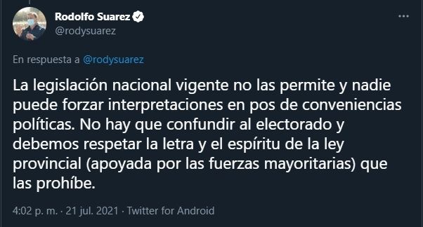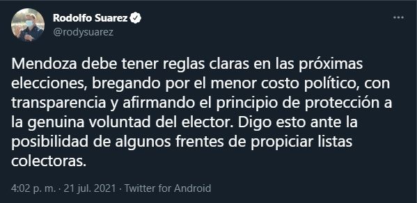 Rodolfo Suarez, gobernador de Mendoza, advirtió a los diferentes precandidatos que se impugnarán las llamadas "listas colectoras", a través de su cuenta de Twitter. Además, le solicitó a los distintos partidos políticos que hay que bregar por el menor costo político, acudiendo a la transparencia en las próximas elecciones que se desarrollarán el 12 de septiembre.