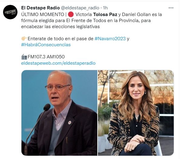 Según informaron en El Destape, la presidenta del Consejo Nacional de Coordinación de Políticas Sociales, Victoria Tolosa Paz y el actual ministro de Salud bonaerense, Daniel Gollan, encabezarán la lista para las próximas elecciones de medio término.