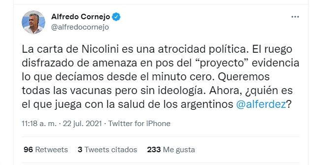 "La carta de Nicolini es una atrocidad política. El ruego disfrazado de amenaza en pos del 'proyecto' evidencia lo que decíamos desde el minuto cero. Queremos todas las vacunas pero sin ideología", aseveró el diputado mendocino Alfredo Cornejo en las redes sociales al tomar conocimiento de esta situación.