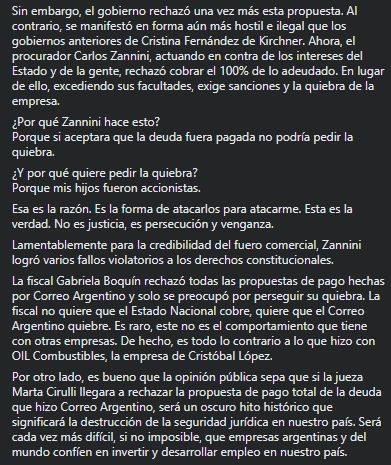 "La fiscal Gabriela Boquín rechazó todas las propuestas de pago hechas por Correo Argentino y solo se preocupó por perseguir su quiebra. La fiscal no quiere que el Estado Nacional cobre, quiere que el Correo Argentino quiebre. Es raro, este no es el comportamiento que tiene con otras empresas. De hecho, es todo lo contrario a lo que hizo con OIL Combustibles, la empresa de Cristóbal López", ironizó el expresidente.