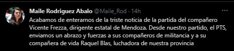 "Acabamos de enterarnos de la triste noticia de la partida del compañero Vicente Frezza, dirigente estatal de Mendoza. Desde nuestro partido, el PTS, enviamos un abrazo y fuerzas a sus compañeros de militancia y a su compañera de vida Raquel Blas, luchadora de nuestra provincia", escribió la diputada provincial Mailé Rodríguez.