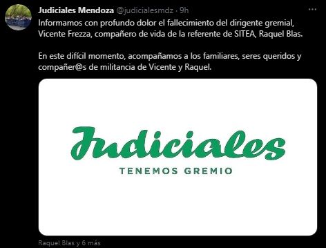 "Informamos con profundo dolor el fallecimiento del dirigente gremial, Vicente Frezza, compañero de vida de la referente de SITEA, Raquel Blas. En este difícil momento, acompañamos a los familiares, seres queridos y compañer@s de militancia de Vicente y Raquel", indicaron desde el gremio de Judiciales de Mendoza.