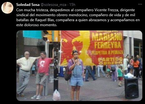 "Con mucha tristeza, despedimos al compañero Vicente Frezza, dirigente sindical del movimiento obrero mendocino, compañero de vida y de mil batallas de Raquel Blas, compañera a quien abrazamos y acompañamos en este doloroso momento", escribió por su parte Soledad Sosa.