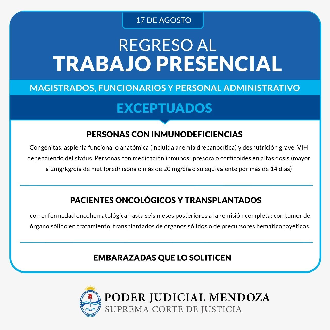 Esta semana se conoció la acordada N° 30.183, que establece el regreso a la nueva normalidad para el Poder Judicial. En el artículo 1 de las resoluciones, el documento señala: "disponer el retorno a la actividad presencial a partir del 17 de agosto del 2021 de todos los agentes, funcionarios y magistrados que se encuentran dentro de la Superintendencia Administrativa de esta Suprema Corte de Justicia, que hayan recibido al menos una dosis de cualquiera de las vacunas destinadas a generar inmunidad contra el COVID-19 y aquellos que pudiendo acceder a la inoculación de la vacuna hayan decidido no hacerlo, con independencia de su edad y condición de riesgo". Además, la acordada aclara que hay 3 grupos exceptuados de esta medida: personas con inmunodeficiencias, pacientes oncológicos y trasplantados y embarazadas que así lo soliciten.