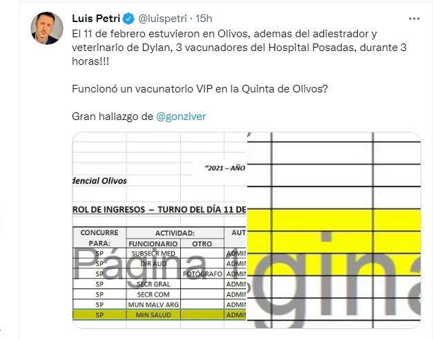 "El 11 de febrero de 2021, días antes de lo de Verbitsky y el vacunatorio VIP, se recibió a la misma vacunadora que le aplicó a Alberto Fernández y a otras dos personas durante 3 horas en la quinta de Olivos", reveló el periodista Gonzalo Ziver y su investigación fue compartida por el diputado nacional Luis Petri.